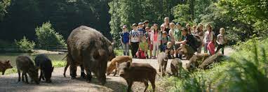 Eine Besonderheit sind die frei umherstreifenden Wildschweine. In Gruppen ziehen sie mit ihren Jungen durch den Naturpark und durchpflücken den Boden nach fressbarem.